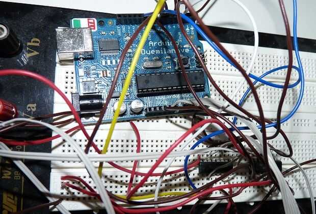 Luego conectar los motores para el puente H y el puente H para Arduino. El siguiente esquema es un poco desordenado, pero que es lo que es, también puedes echar un vistazo en este sencillo tutorial (http://itp.nyu.edu/physcomp/Labs/DCMotorControl ).
