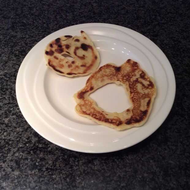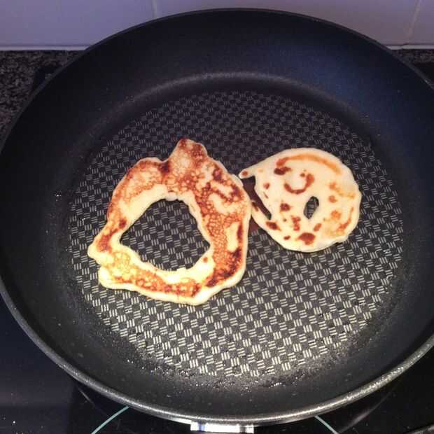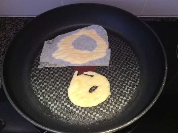 Poner un poco de aceite en una sartén antiadherente y coloque la crepe impresa (por encima de papel de horno) en la bandeja. Espere hasta que este lado de la tortilla está bien hecho. Ahora puede quitar el papel de la hornada y vuelta el panqueque. Ahora espere hasta que la torta esté cocida.