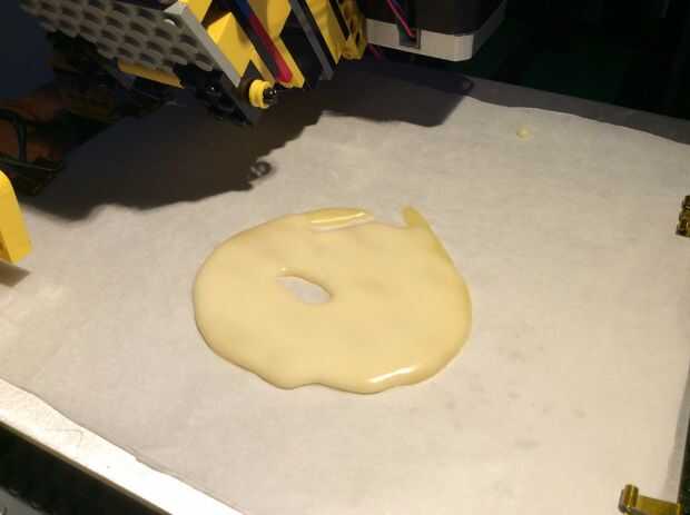 Después de calentar la heatbed, empezamos con la impresión. Después de la terminación de la impresión, la mezcla se calienta por la heatbed. Lamentablemente la heatbed no está lo suficientemente caliente como para obtener la masa bien cocida. Espere hasta que todo se solidifica y retirar el panqueque (con el papel de la hornada) de la impresora.