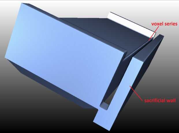 El bosquejo del proceso genera también una placa base biselada de los vóxeles, para hacerlos más fácil de manejar y lugares que a lo largo de una pared de 3 píxeles de anchura en el borde de la placa base que es de 5 capas de alta, para que sean fáciles de ver. También incluye barandillas a cada lado y una pared sacrificio delante de los voxels que se levanta otro 14 capas por encima de ellos, para ayudar a proteger durante el post proceso. Arriba se muestra una representación 3D de la pila de la imagen (en la que la progresión de voxel es apenas visible).