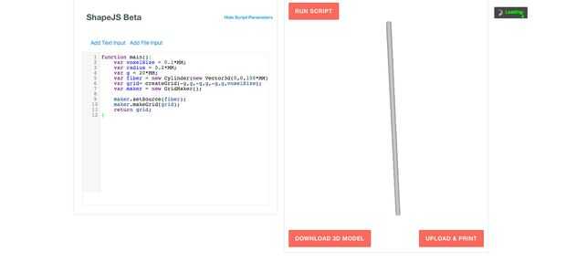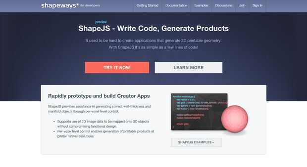 Cabeza en sobre a http://shapejs.shapeways.com/ y haga click en "Pruébalo". Esto le llevará a una pantalla donde verás un fragmento de código y un ejemplo de geometría. Descubrí que me orienta con este código ha ayudado con mi proyecto.