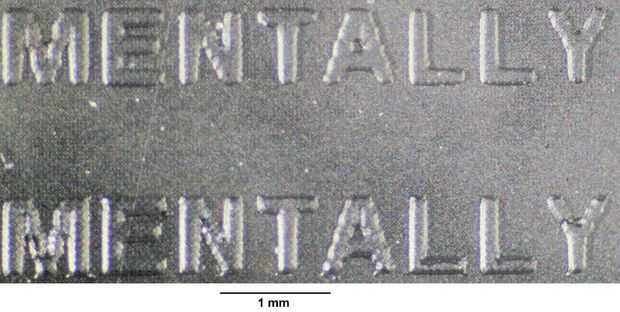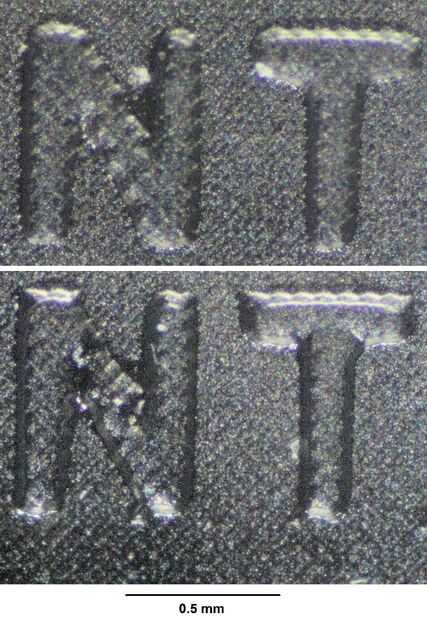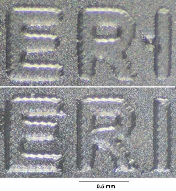 Los efectos de la OPC sobre el texto de punto de 14 pueden verse en estas imágenes ampliadas de la impresión. Cada uno muestra el texto sin corregir sobre el texto corregido. El primero de ellos muestra también la correspondiente porción ampliada de la imagen de la fuente. Incluso en el aumento más bajo, se aprecia que muchas de las esquinas exteriores e interiores son más nítidas cuando se utiliza OPC.