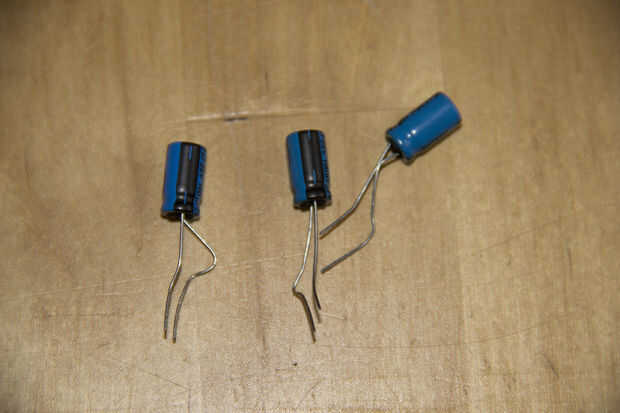 • Tres condensadores, también unos provistos con el kit arduino. He utilizado el 100µF unos. (http://arduino.cc/documents/datasheets/cap100uF.pdf)