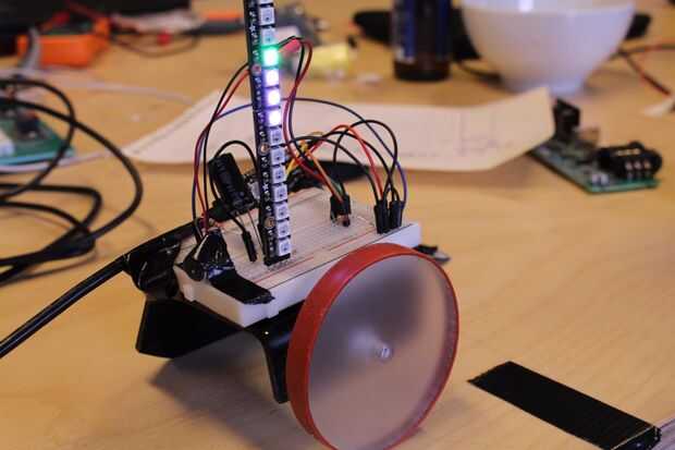 Voy a mover un Neopixel llevó barra de 16 leds sobre una distancia de un metro y mapa mi ondas sonoras grabadas sobre los 16 LED. He optado por hacer un pequeño carro con rueda un codificador que devuelve la posición del carro.
