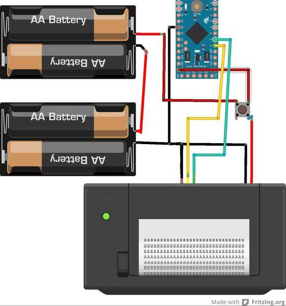 El botón está conectado de tal manera que cuando se conecta el aproximadamente 6V de las baterías a la entrada de primas del Arduino y el Vin de la impresora. Esta configuración ayuda a prolongar la vida útil de la batería porque no hay ningún poder dibujado alguno cuando la impresora está apagada. Sin embargo, significa que usted tendrá que mantener pulsado el botón durante la duración de la impresión.