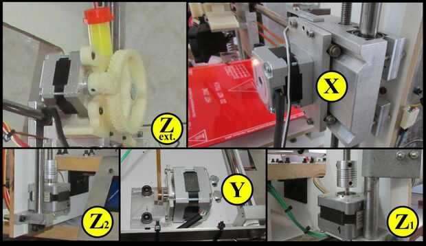 Para el movimiento de los ejes, los motores de pasos NEMA 17 tradicionales fueron elegidos. En todos se ha usado NEMA 17 5:1 para el eje X, otro para el eje Y, 2 motores para el eje Z y 1 motor de la extrusora (mueve el filamento).