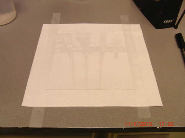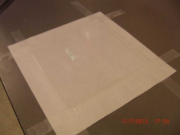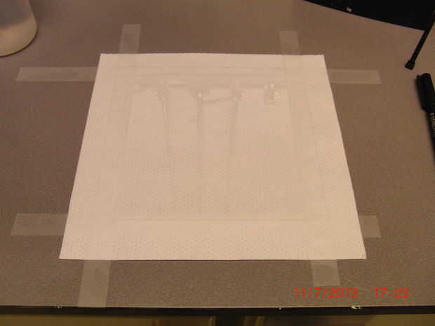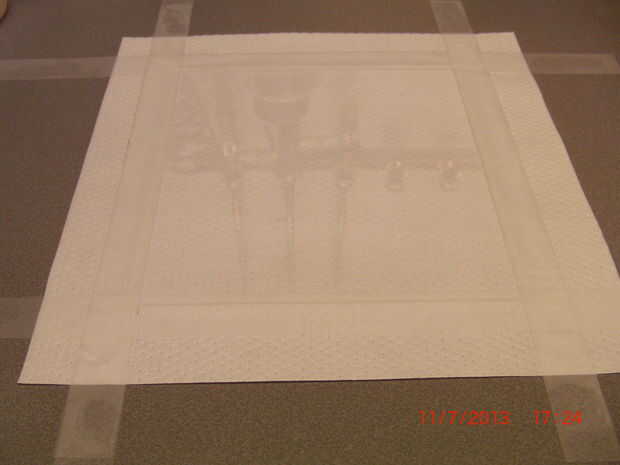 Coloque la ventana en el centro de un cuadrado de papel de cocina (papel sin pelusa es mucho mejor). Aplicar una sola capa de cinta adhesiva en el borde de toda exterior de 5mm de la ventana del fondo. Poner una capa extra de la cinta en el borde izquierdo y derecho.