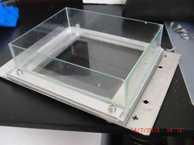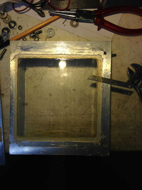La cuenca consta de una placa base en nuestro caso de aluminio. Esto es lo que mantiene unida a toda la cuenca y tiene que ser una estructura rígida. Muelen unas ranuras en la placa base para caber en las paredes de la cuenca. Te recomiendo utilizar vidrio para las paredes de la cuenca, a hacer vidrio de ventana normal de 2mm. Sacrifiqué un marco grande con una ventana de vidrio de 2mm para este propósito.