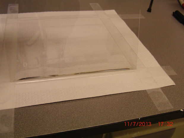 Ahora toma la base y las paredes que se han curado completamente y aplican una tira gruesa de silicona pegamento alrededor del borde en la parte inferior de la placa base. Nota está pegando su ventana debajo de la placa base (ver fotos si claro). Coloque la ventana en el grano del pegamento en la orientación correcta. Asegúrese de que si la base y las paredes están abajo en la mesa de la ventana continúa con la capa frente a la mesa.