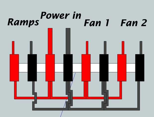 Para el resto (rampas, ventilador y caja del ventilador) construimos nuestro propio diy tren de potencia de una tira de terminales de tornillo. Vea la foto.