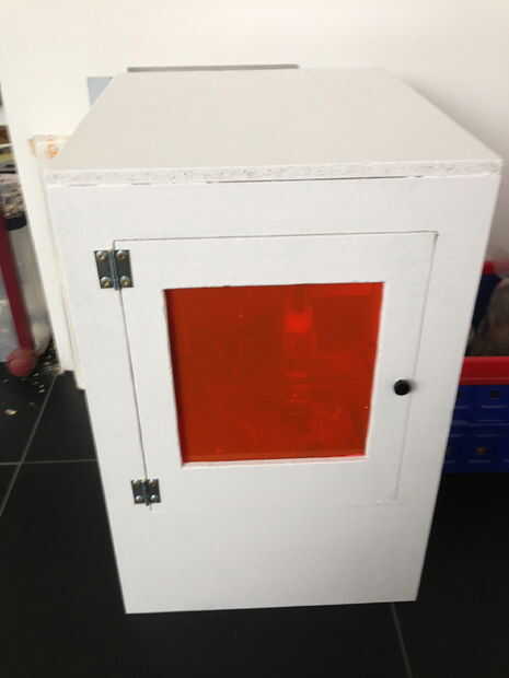 Esto realmente está pensado como una compilación de 4 horas, no lo mas bonito que he hecho pero ffunctionality. Es muy importante a tener en cuenta que la función principal de la caja es para mantener la luz ambiental. La impresora trabaja por el curado de la resina con luz permite decir de debajo de una longitud de onda de 500nm. Por eso queremos mantener a todo el espectro del amarillo hasta UV fuera de nuestra caja. Esto limita considerablemente la opción de windows que podrían poner en.