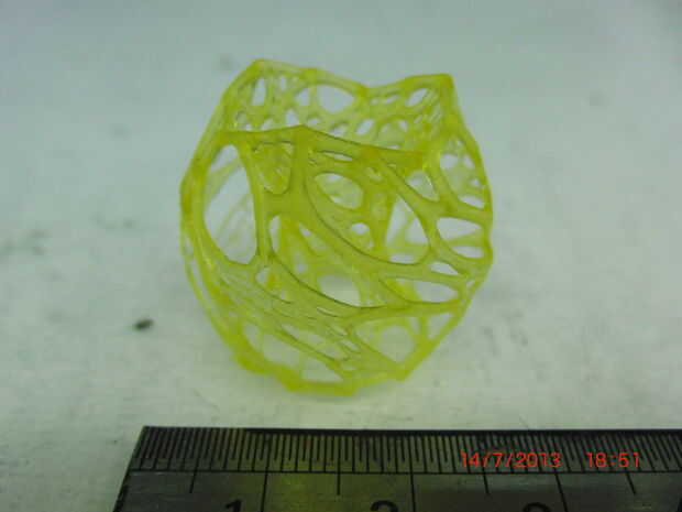 Una vez que haya terminado de impresión, mueva la etapa un poco más hasta su obra maestra es claro de la resina y sobre las paredes de la impresora. Retire la plataforma de construcción y enjuagar la pieza de trabajo con algunos etanol limpio. Una vez limpio, poner en el sol para curar totalmente, 10 minutos es suficiente.