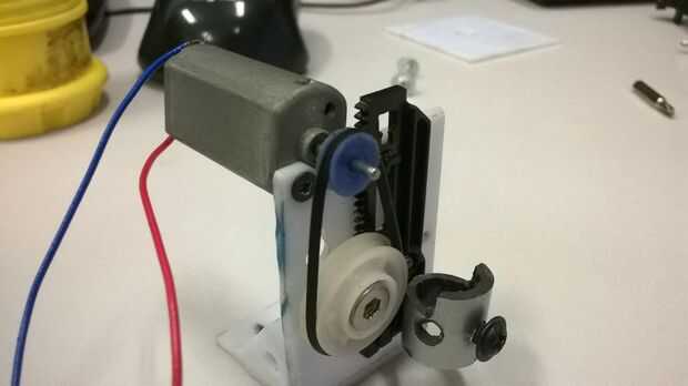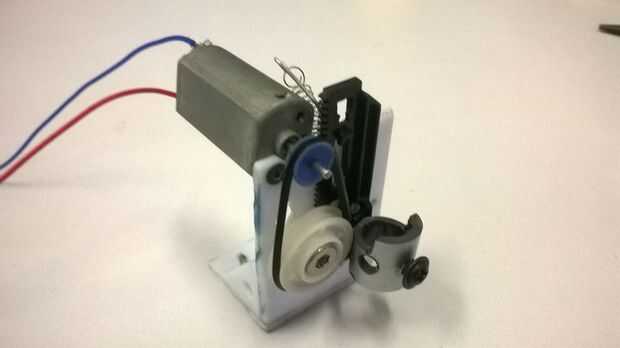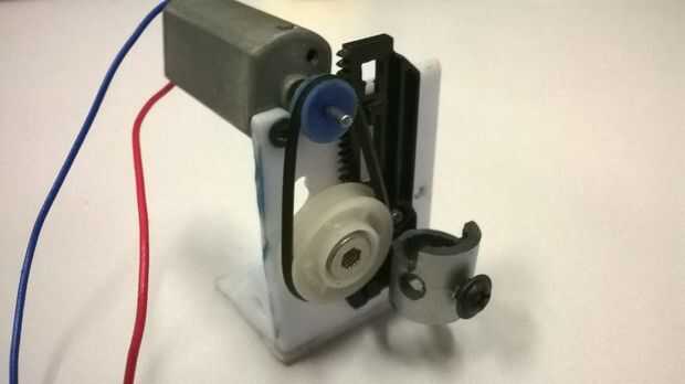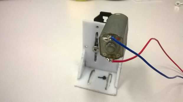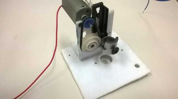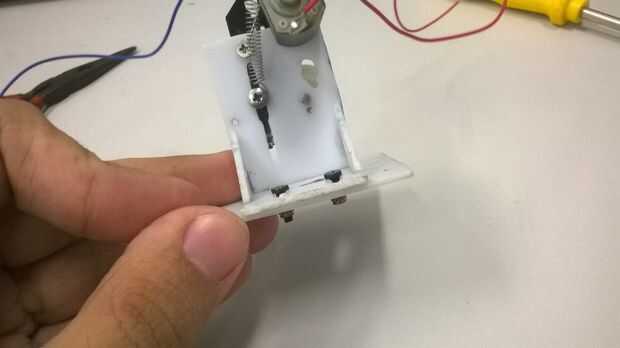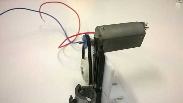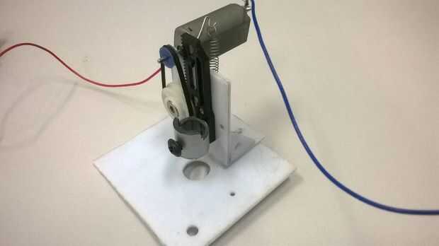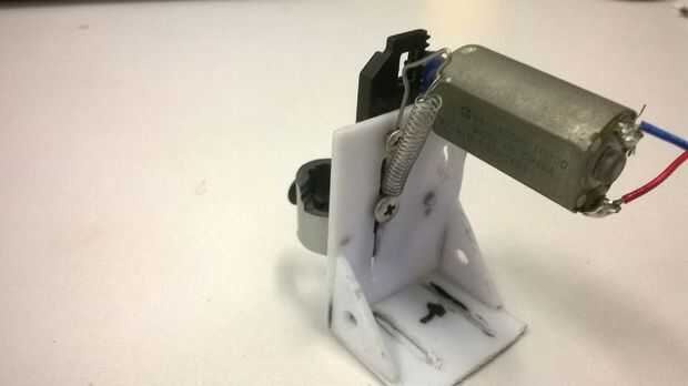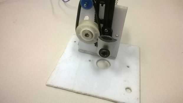 Cuando aplicamos un voltaje en el motor, hace que la pluma hacia abajo, un punto en el papel, un resorte es utilizado para hacer la elevación de la pluma y vuelve a su posición, de esta manera es posible controlar el motor con solo un transistor en lugar de un puente en H.