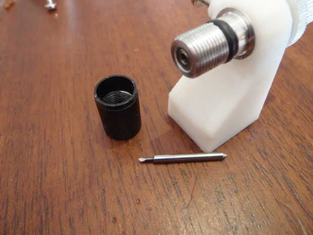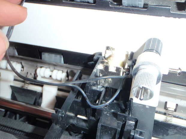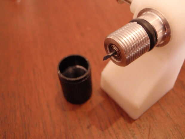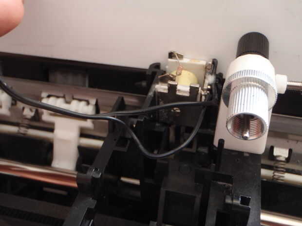 Otra vez todo tiene que estar perfectamente alineados y la tensión del resorte debe ser justo para que el cortador se mueve lejos de los vinilos pero no hasta el momento que el electroimán es incapaz de tirar hacia atrás.