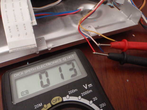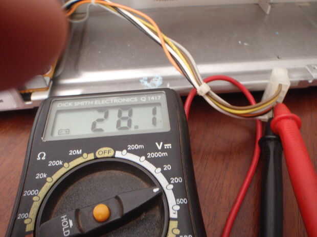 - A continuación he identificado los cables que salen de la fuente de alimentación y el voltaje que resultan para ser de 28 voltios.