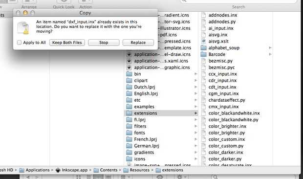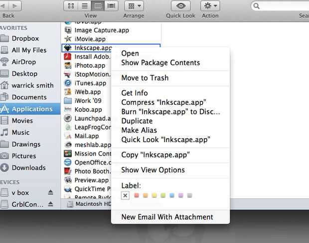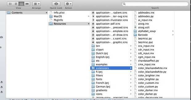 - Una vez que tienes inkscape funcionando cierre hacia abajo y entra en aplicaciones / inkscape / (botón derecho) / Mostrar contenido del paquete.