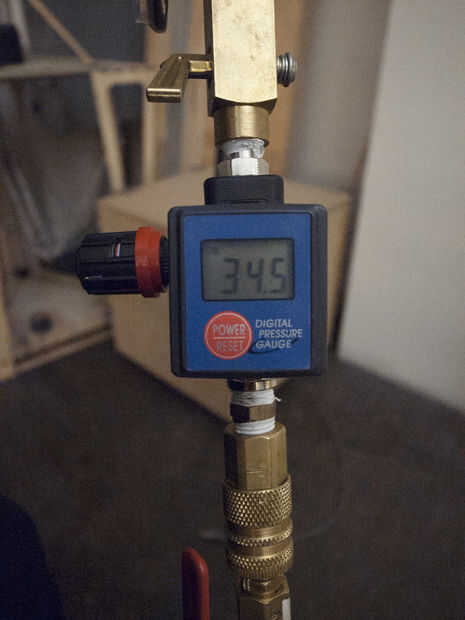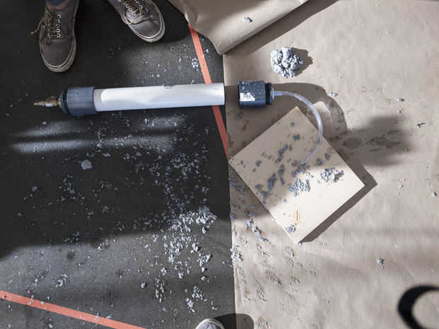 Aire comprimido puede ser peligroso. Absolutamente positiva necesita un regulador de presión cuando se trabaja con aire comprimido. No tenemos una pista al principio, así que conectamos la cámara PVC directamente al compresor de aire. Afortunadamente, no encolado de las piezas (que deberíamos haber hecho, otro error) y una vez tiró a 150 psi en el tubo, sólo transformó el tubo en un cañón en lugar de una bomba de la pipa que habría causado algunos daños como estábamos sosteniendo el artilugio en nuestras manos. Otra coincidencia afortunada fue que nos pasó para que apunte hacia la esquina entre el piso y la pared, para que no golpee a nadie (sólo dejó una abolladura enorme en un trozo de MDF y un dedo ligeramente amoratado).