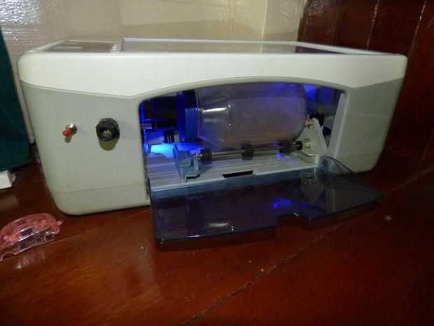 Ahora que tienes todo conectado, es hora de poner algún poder a esta impresora hackeada. Usé un viejo adaptador de corriente que tiene una salida de acerca de 13v. DC. Asegúrese de que el adaptador de alimentación salidas de un dc. tensión. Recomiendo usar un adaptador de corriente salidas nada de 9 a 15 voltios. Dependiendo de la tensión podría conseguir el motor en caliente después de varias horas de uso. Sólo tienes que probar los varios voltajes que puede manejar el motor.