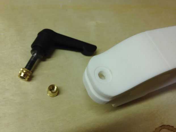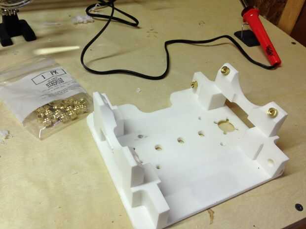 Con los grabados de SLS Nylon iniciales en mano, estaba listo para comenzar la Asamblea. Esto comenzó con insertos de latón termoplástico que pedí anteriormente. En caso usted está preguntando por qué esto es necesario, me permiten proporcionar información adicional. El nylon impreso 3D es durable loco y no frágil, así que las posibilidades de que rompa es delgado a ninguno. Sin embargo, roscado de nylon impreso 3D no va a dar uso confiable cuando se mira el panorama general de la fiabilidad a largo plazo. Los insertos de latón termoplásticos son la solución. Se derritan en el nylon con un soldador. Una vez insertado, le corte al hilo hacia fuera a menos que el nylon se calienta hasta 800 grados para soltar el nylon que agarra los bordes diagonales que cubre el exterior del inserto. Los objetos impresos 3D ligero ultra ahora han roscado agujeros que son de metal al igual que mis pesados equivalentes de aluminio. Esto asegura las conexiones confiables y robustas para montar todo el sistema y soportar de manera segura varios mil dólares del equipo de D-SLR.