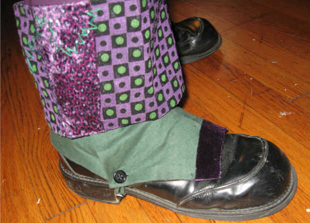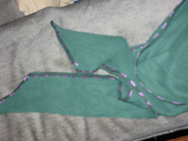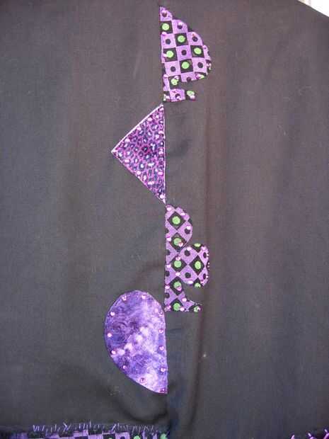 Las colas fueron construidas por la forma general de dibujo sobre un pedazo grande de papel de periódico, entonces la corte de tela púrpura (una camisa de los hombres vestido que obtuve de 97 centavos de dólar). Luego arreglé grandes franjas de mi tela fantasia varios partituras en las colas, les pegan con cinta fusible, y cuando estaba satisfecho les cosí con hilo de botón. Más tarde usé hilos colores brillantes para acentuar las costuras.