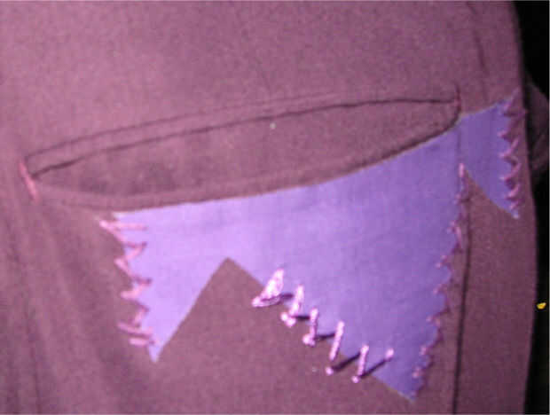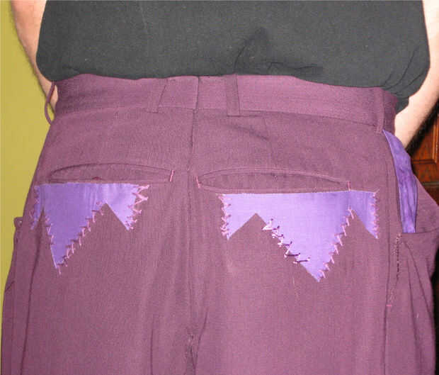 Ahora he añadido un par de fotos que muestran las alteraciones a los pantalones. Además de los puños (la alteración más evidente), eliminación de cinco pulgadas de cintura causado también los bolsillos en la espalda para mover realmente, realmente juntos. Contraatacó este problema cortando algo zigzag morado de tela el ancho exacto de las bolsas, los fusible y con hilo de las correas. Pero contrarrestarlos, por lo que el ojo pueda ver naturalmente como aletas del bolsillo en el lugar donde los bolsillos pertenecen realmente y tal vez la gente no cuenta de donde son mis bolsillos real. En cualquier caso, va solo se deja entrever, ya que la mayoría del tiempo que van escondidos detrás de la cola de la capa.