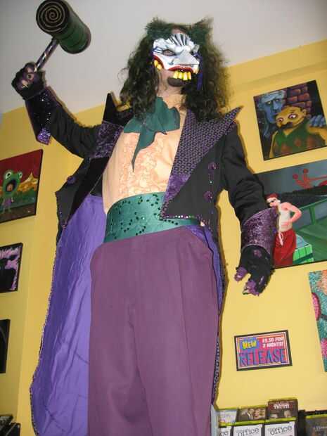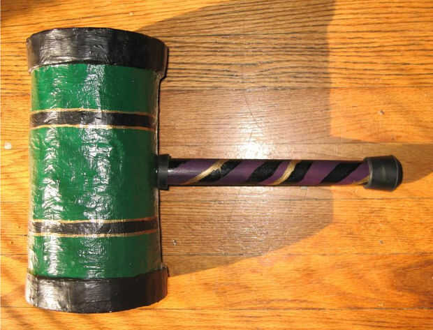 Los tacos vienen de una longitud estándar, que era demasiado larga para mis propósitos, después de que fue pintado tenía parte de la sierra. Una vez que se completó la caña pimp, tuve un par de días antes de Halloween así que decidí tomar la longitud desechada de caña y utilizarlo como el mango de un martillo grande (creo que con cariño fui recordando mi viejo bromista la figura de acción, que vino con un accesorio de martillo gigante). Había hecho una cabeza de martillo de cartulina y papel maché, luego había pintado para coordinar con el resto de mi vestuario.