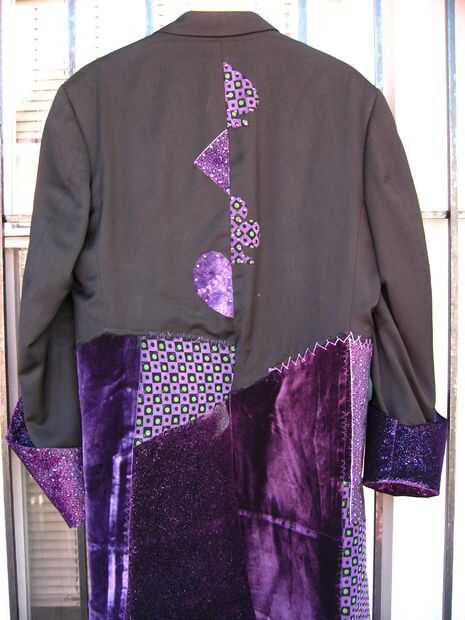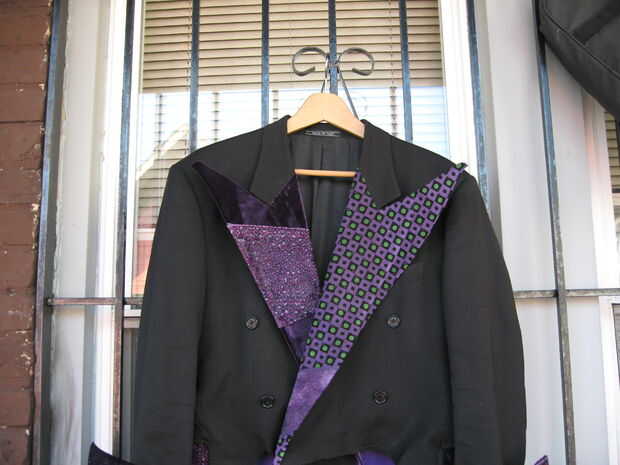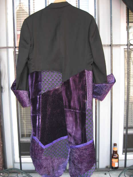 A las tiendas de segunda mano! Compré una chaqueta de traje italiano negro a trabajar y una serie de prendas de vestir de la mujer extraña que fueron seleccionados por sus telas. Yo había planeado originalmente encontrar una chaqueta de terciopelo negro y una chaqueta de terciopelo morado y convertirlo en algo como una chaqueta negra con solapas y colas púrpura. Pero fueron sorprendentemente escasas chaquetas de terciopelo, y decidí que sería más interesante hacer una especie de remiendo púrpura.