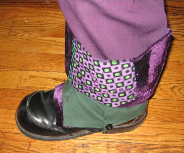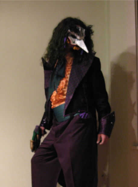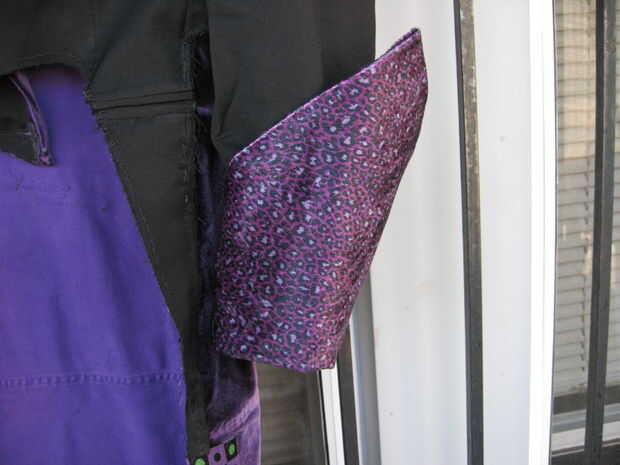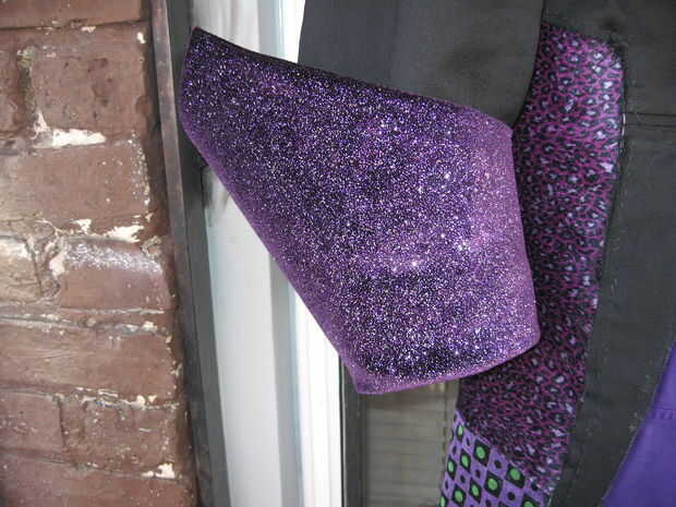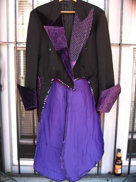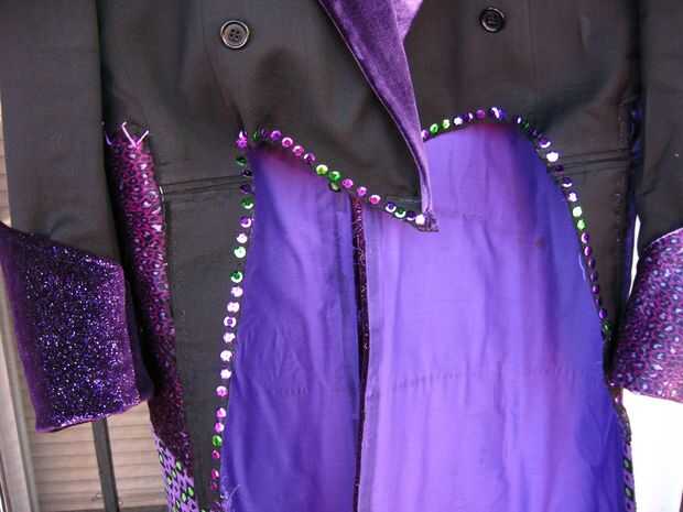 Encontré un vestido de princesa de terciopelo morado, suéter de las niñas de terciopelo morado de lentejuelas, una tapa del tanque leopardo púrpura y un par de artículos, que comencé a hack para arriba y ajuste detrás junto otra vez como colas para mi frac. He ampliado los puntos de las solapas por varias pulgadas y había añadido enorme puntiagudos puños a las mangas.