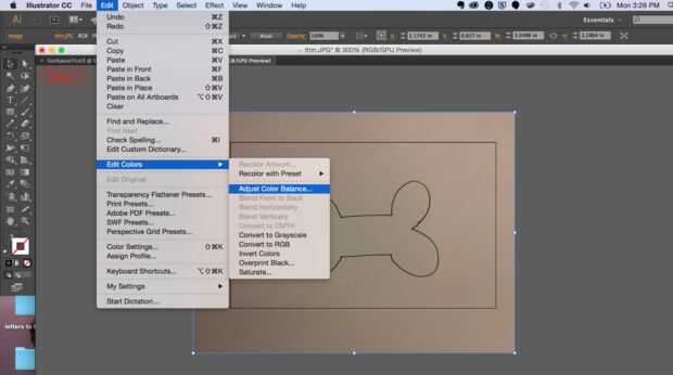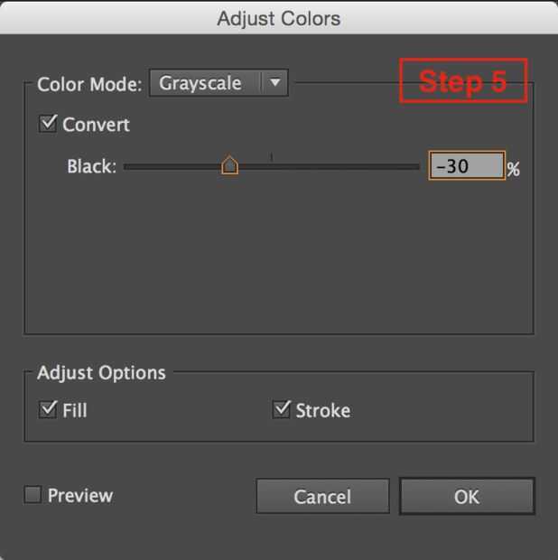 - Seleccione "Editar" -> "Editar colores" -> "Ajustar equilibrio de Color" -> "Convertir a escala de grises". En el bardo de desplegable color mode seleccione "Escala de grises". Marque la casilla de "Convertir" y reducir el "% negro" a cerca de -30%.