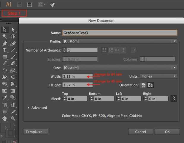 - Abierto Adobe Illustrator. Seleccione "Archivo" -> "Nuevo". "Dimensiones de la página", "Anchura" de entrada = 64 mm y "Height" = 40 mm, que son las dimensiones de la plataforma de construcción de Ember.