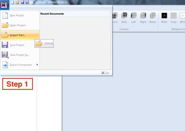 1. Haga clic en el icono dentro de médica en la esquina superior izquierda y seleccione "Importar". Busque y abra el archivo STL.