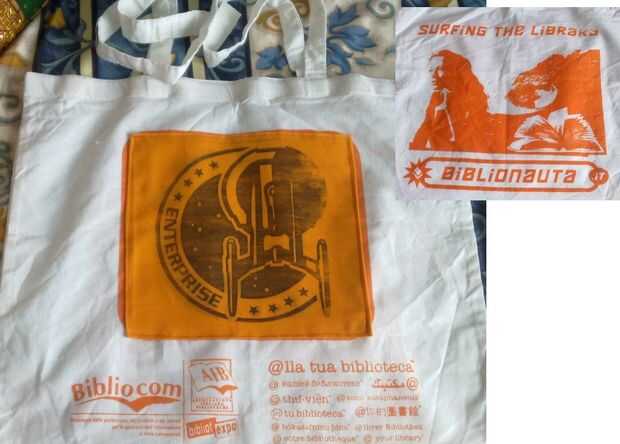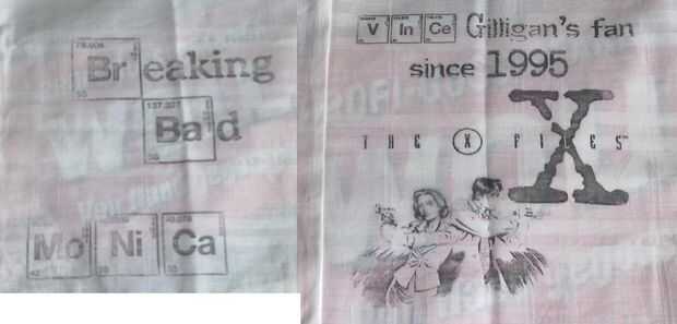 Me gusta bolsas reutilizables, tengo un bolso de tela de publicidad, así que lo imprimí en un pedazo de tela algunas imágenes y palabras de algunos de mis programas favoritos de televisión (Star Tre: empresa; Los archivos de X; Breaking Bad) y cosido a las bolsas.