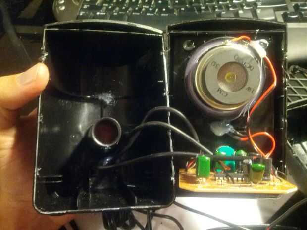 Si los altavoces no están ensamblados con tornillos entonces deberás quitar el plástico alrededor de los componentes. Tomé un destornillador y una herramienta de palanca para dividir los lados. El amplificador debe estar en la unidad con el cable de alimentación y aux.