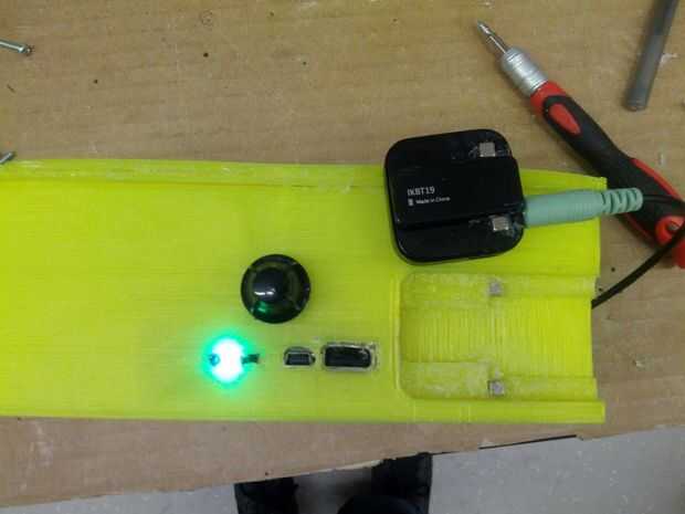Inserte la tarjeta electrónica en la carcasa superior y asegúrela con tornillos y pegamento caliente. Una pequeña cantidad de espuma de la bocina original de la vivienda fue utilizada para bloquear los respiraderos laterales de dejar residuos en la vivienda. Un pequeño toque de pegamento caliente alrededor de los puertos bloquea cualquier problema de espacio.