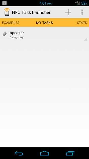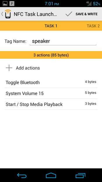 He sentido poner capacidad de NFC de mi teléfono para usar y pensé que ya era hora que lo hice a través de este proyecto. Después de comprar las etiquetas que pueden venir de muchas fuentes diferentes, descargar una aplicación llamada NFC Task Launcher. Haga clic en el botón Agregar para crear una nueva tarea de NFC. Puede darle un nombre y establecer un puñado de tarea para iniciar cuando se toca la etiqueta. Por ejemplo, decidí iniciar mi conexión Bluetooth, máximo el volumen y abrir una app de música. Una vez que haya terminado, pulse guardar y escribir mientras tenga su teléfono sobre la etiqueta. La información se almacenará y ahora cada vez que toque la etiqueta en el altavoz, inmediatamente se conectará sin pasar por los menús para configurar su conexión.