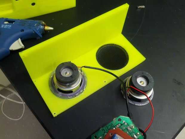Las rejillas del altavoz fueron super pegadas en lugar. A continuación, los altavoces fueron colocados en la parte superior y caliente pegados a la superficie de las rejillas.