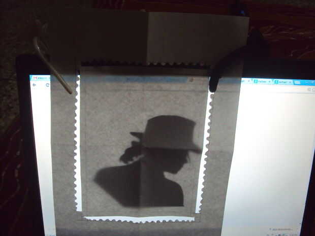 En su computadora portátil, abra la imagen que desea imprimir en el sello. Colocar el papel sobre la pantalla del portátil y fijarla con clips.