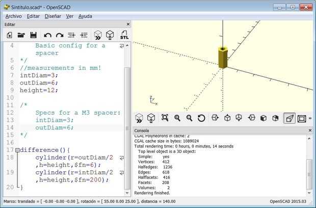 ¿Qué hacer?, decidí usar OpenSCAD, un modelador paramétrico y peso súper ligero, este código es para un separador de M3 de 12 mm de altura, cambiar las dimensiones de sus necesidades, vamos a hacerlo!