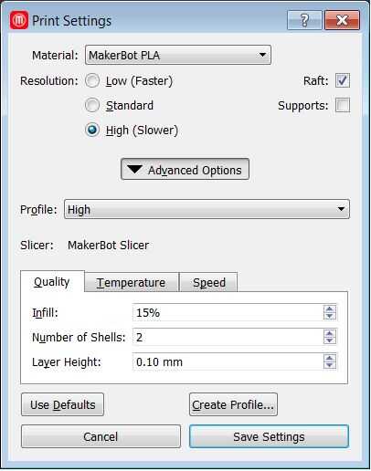 - Te recomiendo de alta resolución (ver imagen para más información), se puede jugar con este parámetros en el software de la impresora. (Nota: Compruebe la temperatura y la velocidad, uso de Makerbot representante 2 PLA)