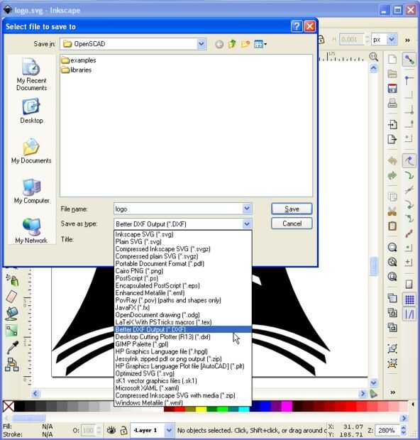 8. en el menú archivo elegir Guardar como... y elegir mejor salida DXF (*. DXF) en el menú desplegable. Nombre su archivo logo. DXF y recuerde cuando se guardar para que usted pueda utilizar para el siguiente paso.