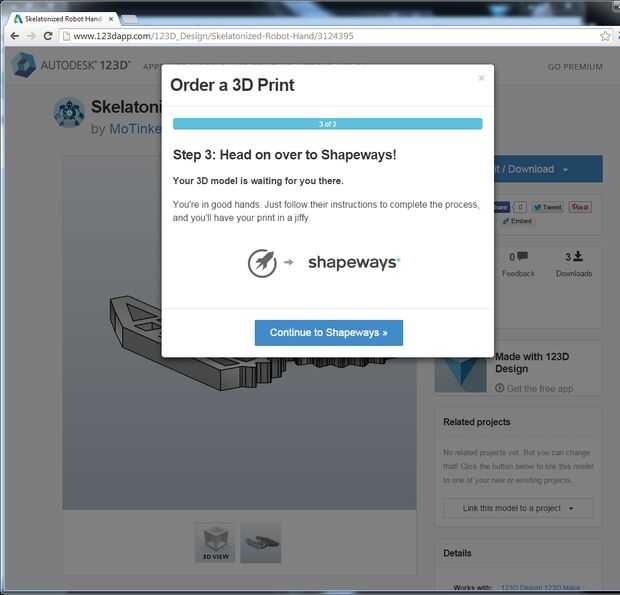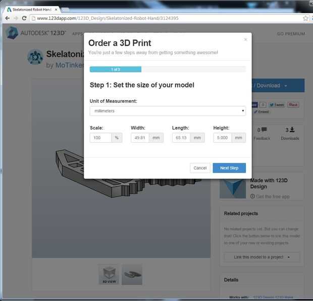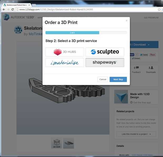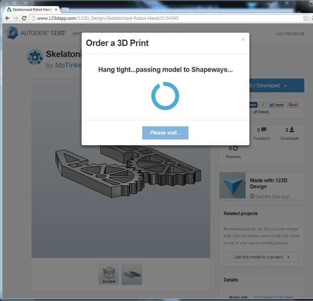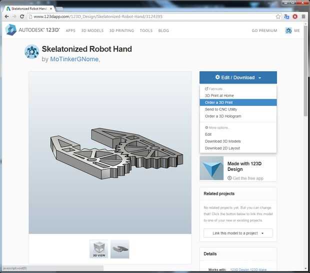 Después de abrir el modelo en 123Dapp.com, haga clic en Editar/descargar, imprimir orden una 3D y confirmar el tamaño del modelo. Esto funciona a aproximadamente 5mm de espesor por 50mm de ancho por 60 mm de largo. Seleccione el servicio de impresión de su elección. He trabajado con Shapeways en el pasado y como la calidad de su trabajo así que voy a usarlos otra vez.