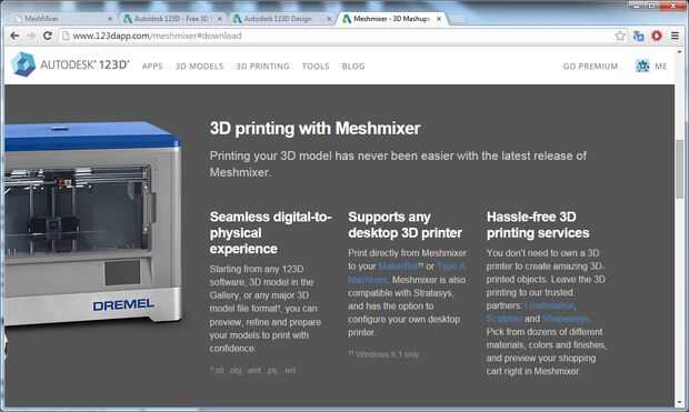Descargar e instalar "MeshMixer" es un prerrequisito para "123D Design". Si se salta este paso "123D diseño" ofrecerá para descargar para usted, sin embargo mejor prácticas incluyen la instalación de requisitos previos antes de que se necesitan.