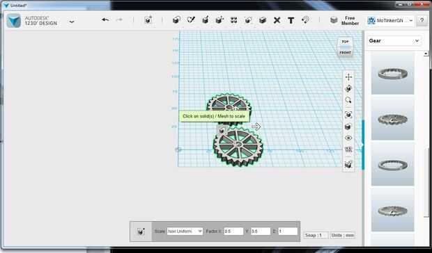 Una vez que se agrupan los 2 engranajes usted puede cambiar el tamaño los dos al mismo tiempo. Haga clic en una de ellas y seleccione escala (indicado en la tercera opción del cuadro de la derecha en la barra inferior)