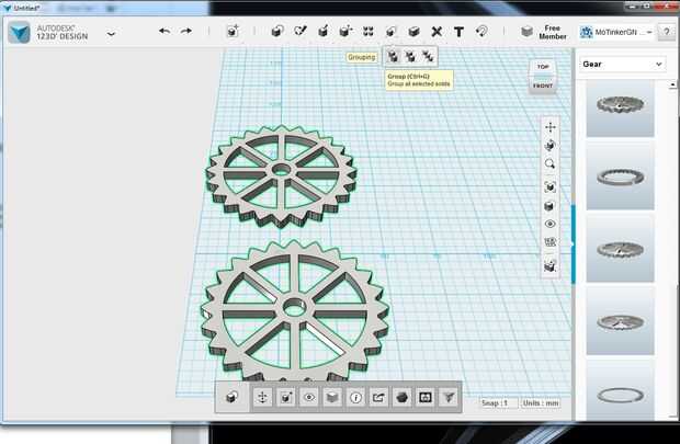El primer paso va a agruparlos. He pinchado en el borde superior frontal del cubo posicionamiento para cambiar mi ángulo de visión. Entonces arrastró un cuadro de selección alrededor de los 2 engranajes. Y presiona CTRL + G para agrupar juntos. O puede hacer clic en los iconos como se indica en la imagen.