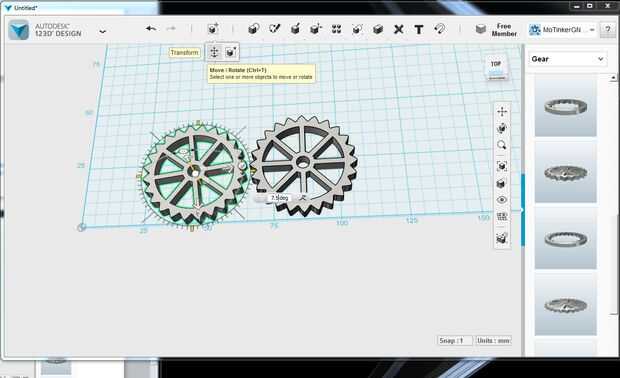 Alinearon las marchas y ahora voy a seleccionar uno, presione Ctrl + T (o el indicado en la imagen de la ubicación gráfica) para la herramienta de transformación. Haga clic en el círculo de rotación en la posición 3:00. Encontré que los 7.5 grados malla adecuadamente los engranajes, por lo que he escrito en el cuadro y presione entrar. Usted verá que la marcha ha girado y ahora usted puede arrastrar a una posición con malla para comenzar a dibujar los dedos de la pinza.