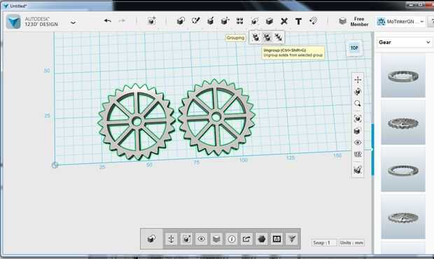 Para garantizar que los engranajes se malla juntos correctamente después agregamos los dedos es necesario desagruparlos. Arrastre un cuadro alrededor de ellos otra vez y seleccionar desagrupa, Shift + CTRL + G, o a través de las casillas indicadas. .