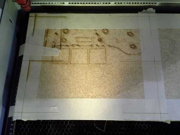 Envíe su patrón completo, marcas y todo. Para la primera carrera a través del software de control de láser, desactivar el patrón de vector para las líneas del corte finales. Queremos grabar líneas rápidas en la cinta para obtener las marcas de referencia.