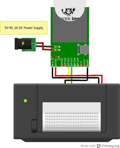A energía: tenemos que conectar la impresora, también. Nosotros te alambre Vin de la impresora y de la tierra hasta las clavijas de Vin y tierra en el imp eléctrico breakout Junta, que pasará a la fuente de 5V a través de la impresora.