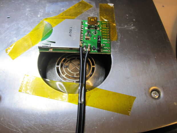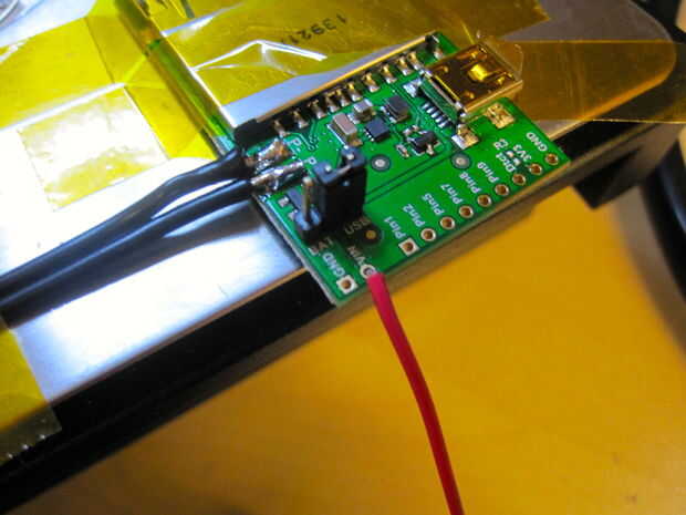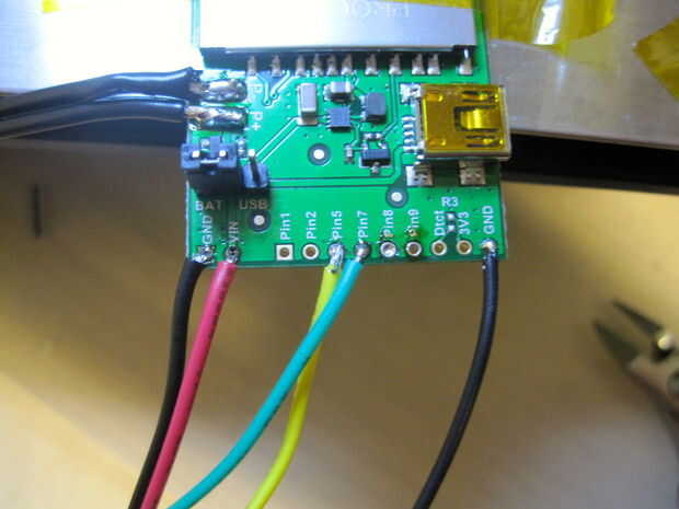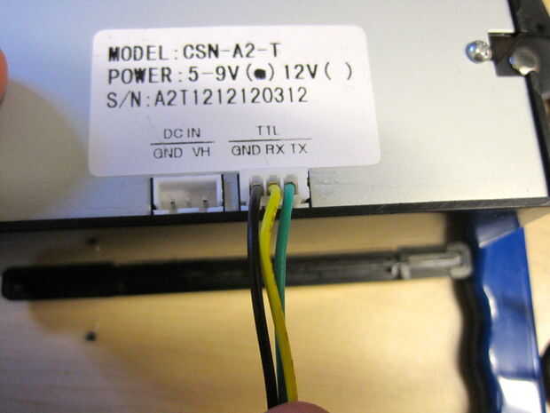 - Este ejemplo realmente no escucha a los datos en serie de la impresora, pero se puede sin duda; puede decir cosas como si se está trabajando en una escritura, o si es por papel. Pele el extremo del alambre verde y soldar al pin 7 en el tablero de arranque.