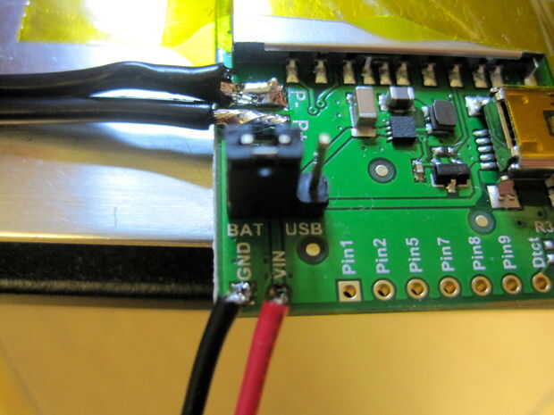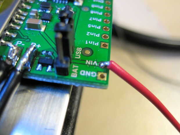 - Suelde el cable rojo de Vin de la impresora a la almohadilla de "Vin" en su tabla de arranque electric imp.